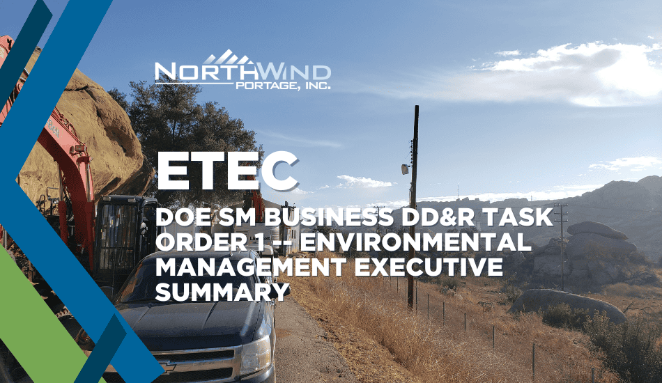 In May 2024, North Wind Portage, Inc. was selected by the U.S. Department of Energy (DOE) to manage and provide environmental monitoring, surveillance and maintenance (S&M), and project support activities at the DOE Environmental Management (EM) Energy Technology Engineering Center (ETEC) site under the first Task Order awarded under DOE-EM’s Small Business Nationwide Deactivation, Decommissioning and Removal (DD&R) contract. The ETEC scope includes preparation of demolition and removal work plans; providing support for the California Department of Toxic Substances (DTSC) California Environmental Quality Act (CEQA) Environmental Impact Report (EIR); completing the Data Gap Analysis Report and associated sampling, groundwater activities; and preparation of the Soils Remedial Action Implementation Plans.